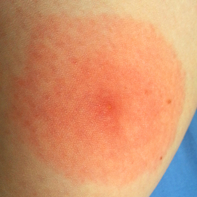 Starke Muskel- und Gelenkschmerzen, extreme Kopfschmerzen mit Nackensteifigkeit setzten mich wochenlang außer Gefecht. Nach ca. 3 Tagen dieser Symptomatik entwickelte sich ein Erythema migrans. Diese rundlich ebene Rötung wuchs täglich. Die Ränder wurden größer. Innen verblasste diese Rötung.